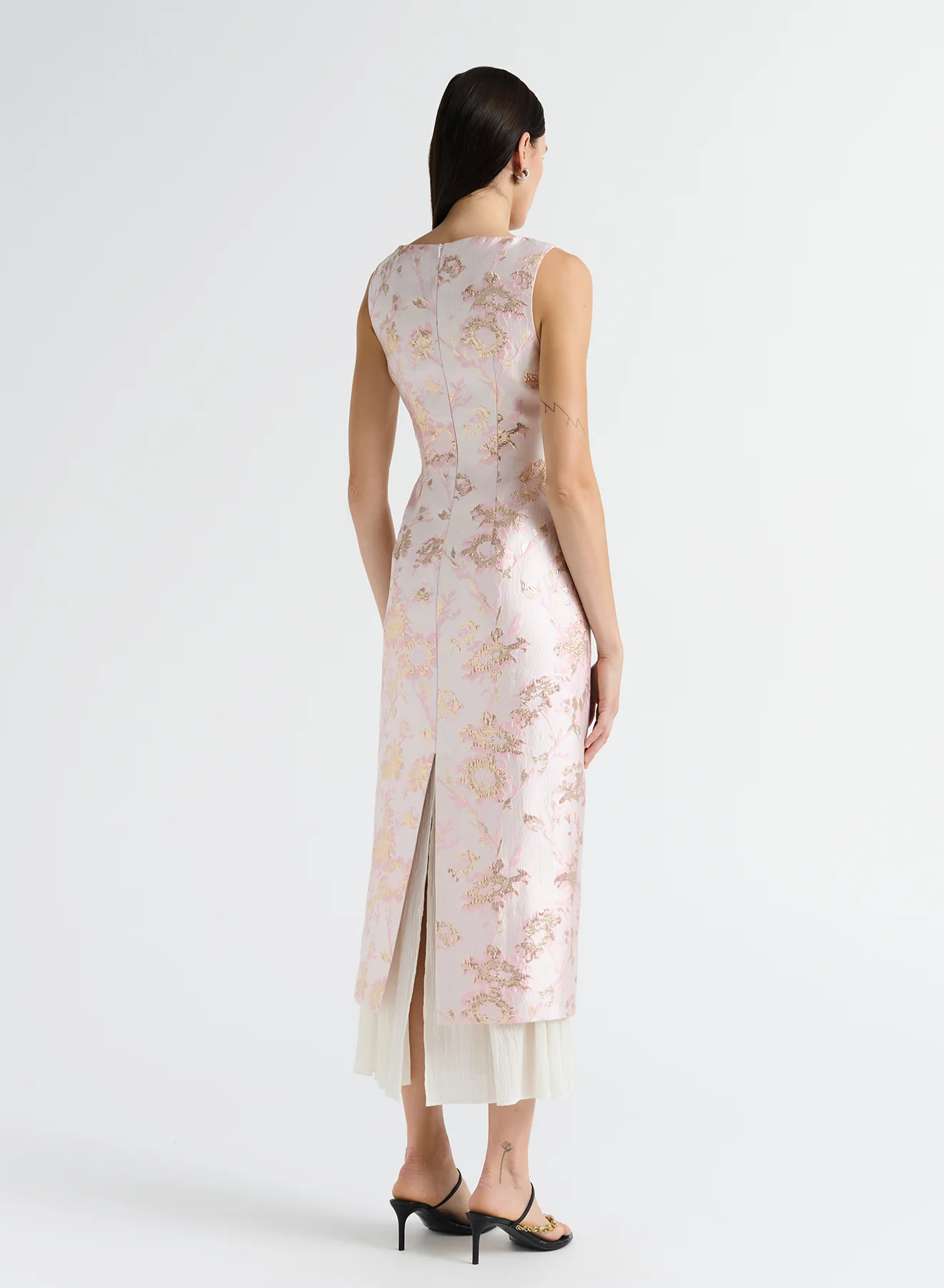 The Olivia Dress in Rosewater with Shell features a low scoop neckline design, this midi length dress will last in your occasion wardrobe for years to come. Cut in a brocade fabrication, featuring intricate patterns and shimmering Lurex metallic threads with a contrasting layering skirt that peaks through at the hem. Completed with a split at the center back for ease of movement and an invisible zipper at the back to close.