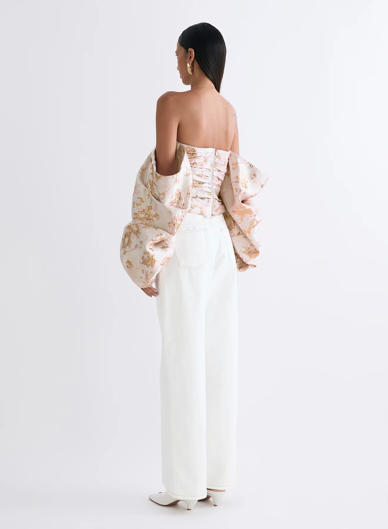 The Melissa Top in Rosewater has been designed in a new custom brocade fabrication with shimmering Lurex metallic threads throughout. Showcasing a strapless neckline with exaggerated statement sleeves. Detailed tucks are featured across the bodice with an internal bra closure and boning for structure and support.Â