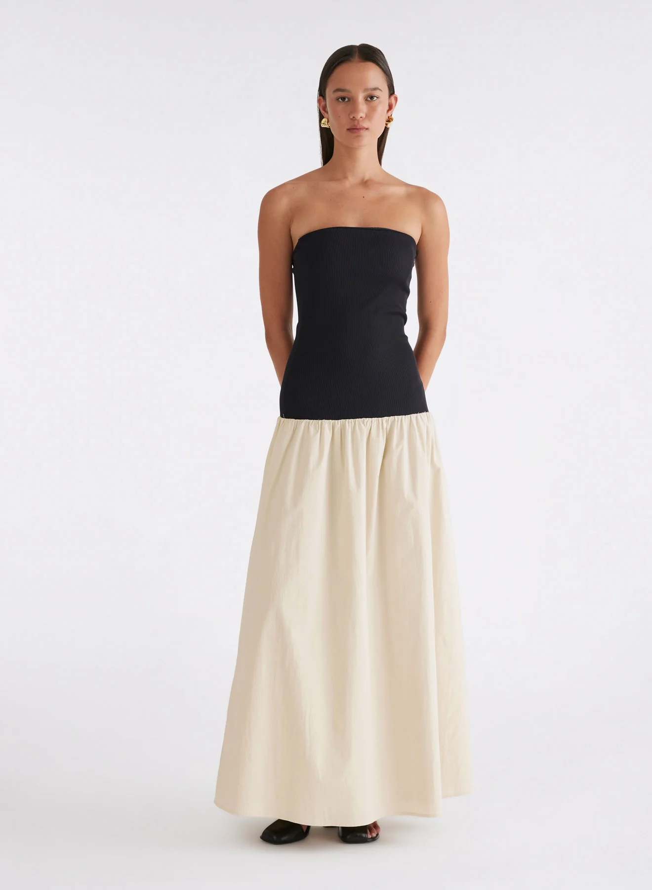 An understated silhouette that celebrates figure and form. This strapless multi media dress is cut in a finely woven cotton poplin, contrasted with a ribbed jersey offering sleek comfort. The design details a bandeau neckline and a drop waist skirt, gathered to create elegant volume. Style for any occasion with the right accessories.
