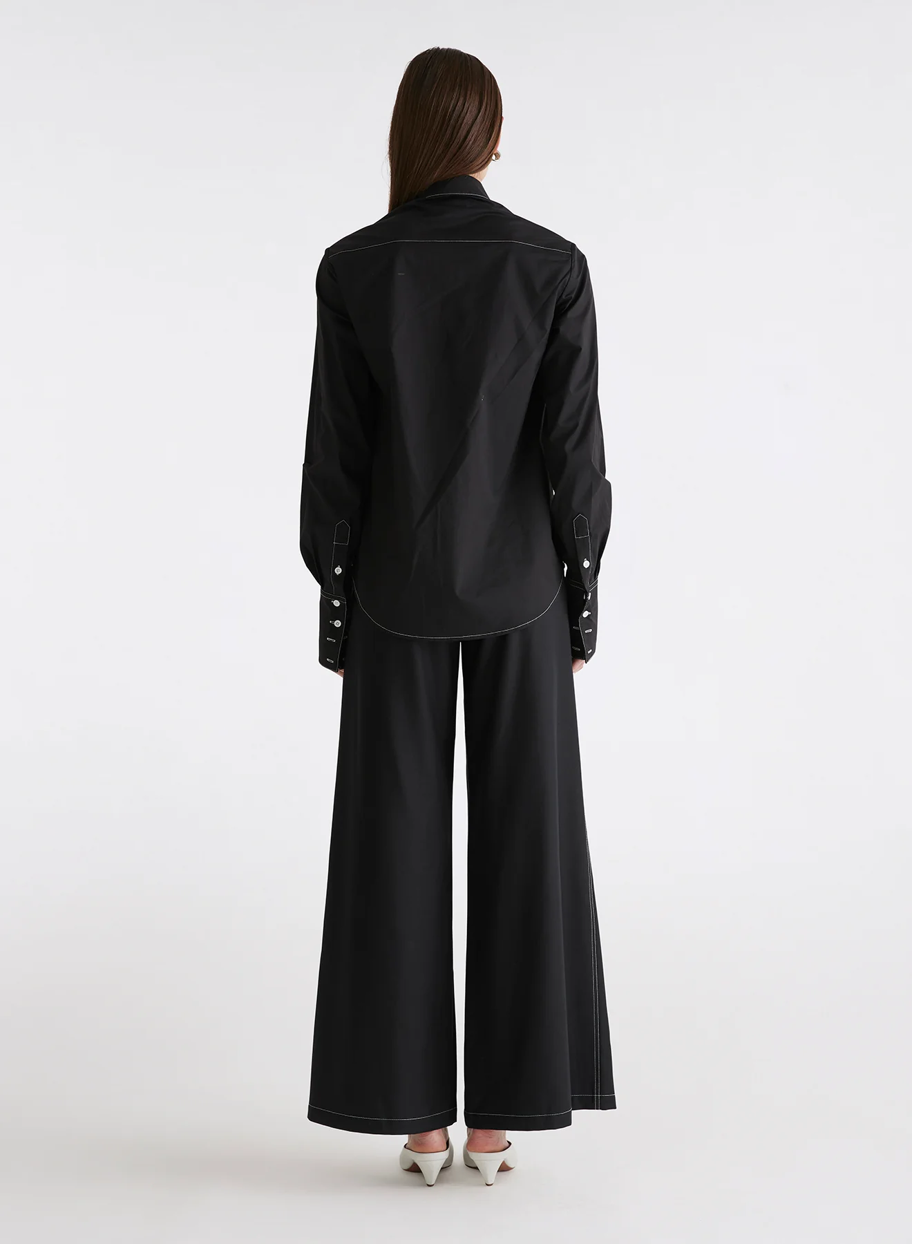 The Lenny Pants in Black w/ Top Stitch are a transeasonal wardrobe staple. Crafted in a luxurious lightweight wool blend, these wide leg trousers feature a flattering high and pockets. Showcasing a fluid silhouette and tailored lines the Lenny Pants are versatile for work wear. Style with the Phillipa Top for the full set.Â