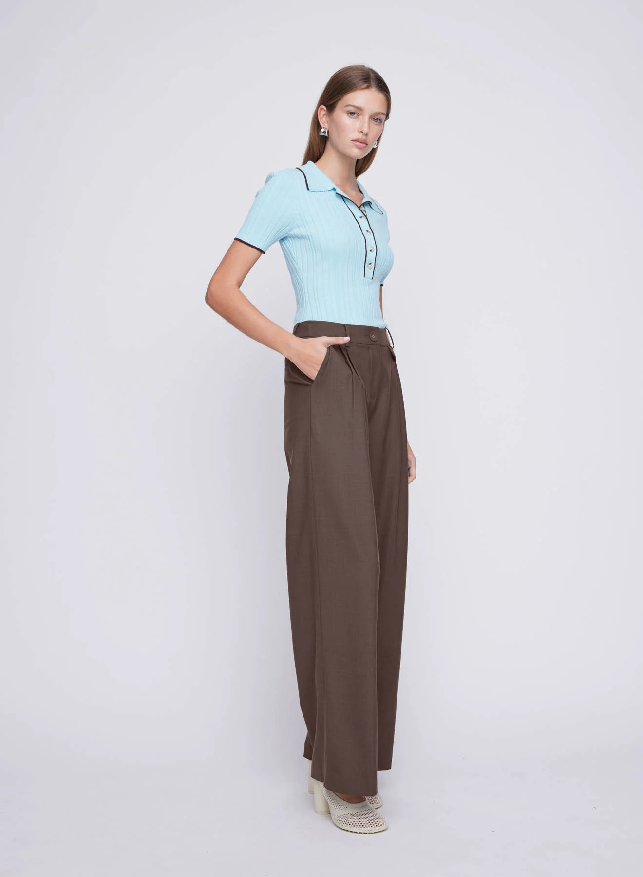 The Nico Pant in Chocolate is our best selling tailored pant. Designed to sit slightly lower than the waist, these straight leg pants are cut in a lightweight 100% wool twill, featuring single tucks for ease of movement. Finished with a neat coin pocket at the waistband, you can style yours with a slim knit or a matching blazer to build your capsule wardrobe with minimal effort. Complete the look with the Bailey Top in Chocolate.