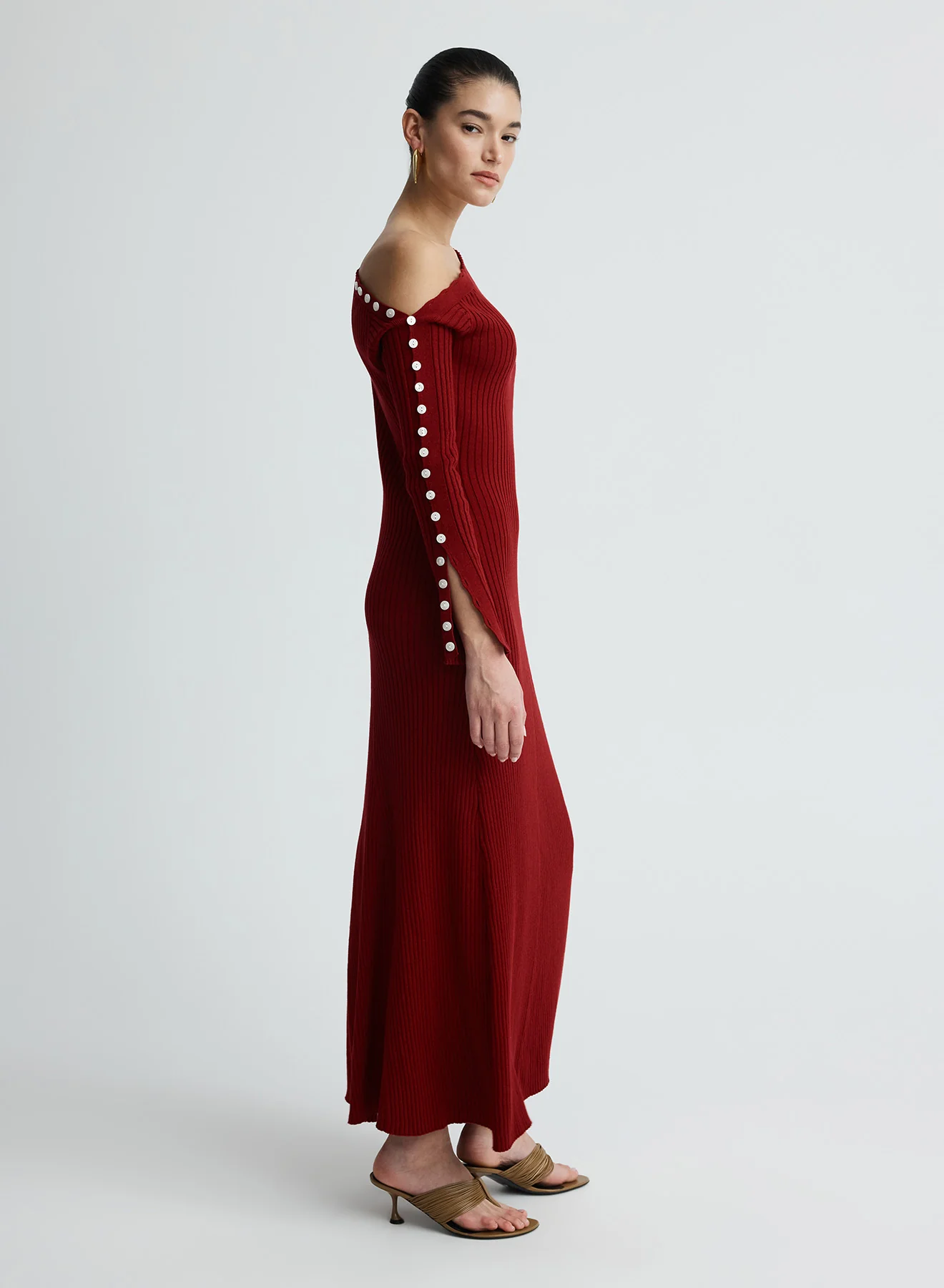 The Noah Dress in Sangria is a long sleeve midi dress crafted in a knitted cotton rib. Designed with an asymmetric and one-shoulder neckline, the dress is finished with a rouleau loop closure along the arm. Completed with a slight flare at the hips.Ā