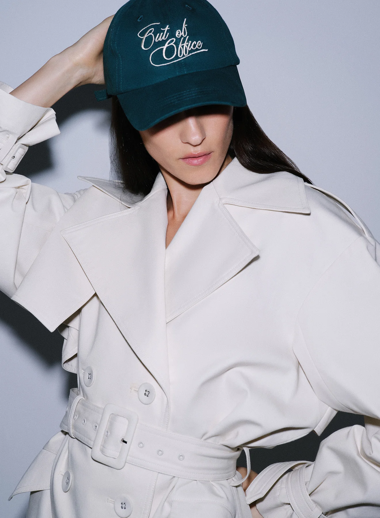 Introducing the ANNA QUAN Out of Office Cap in Green. Featuring custom white embroidery and an adjustable back clasp, this 100% cotton cap can easily be worn day to day throughout summer.