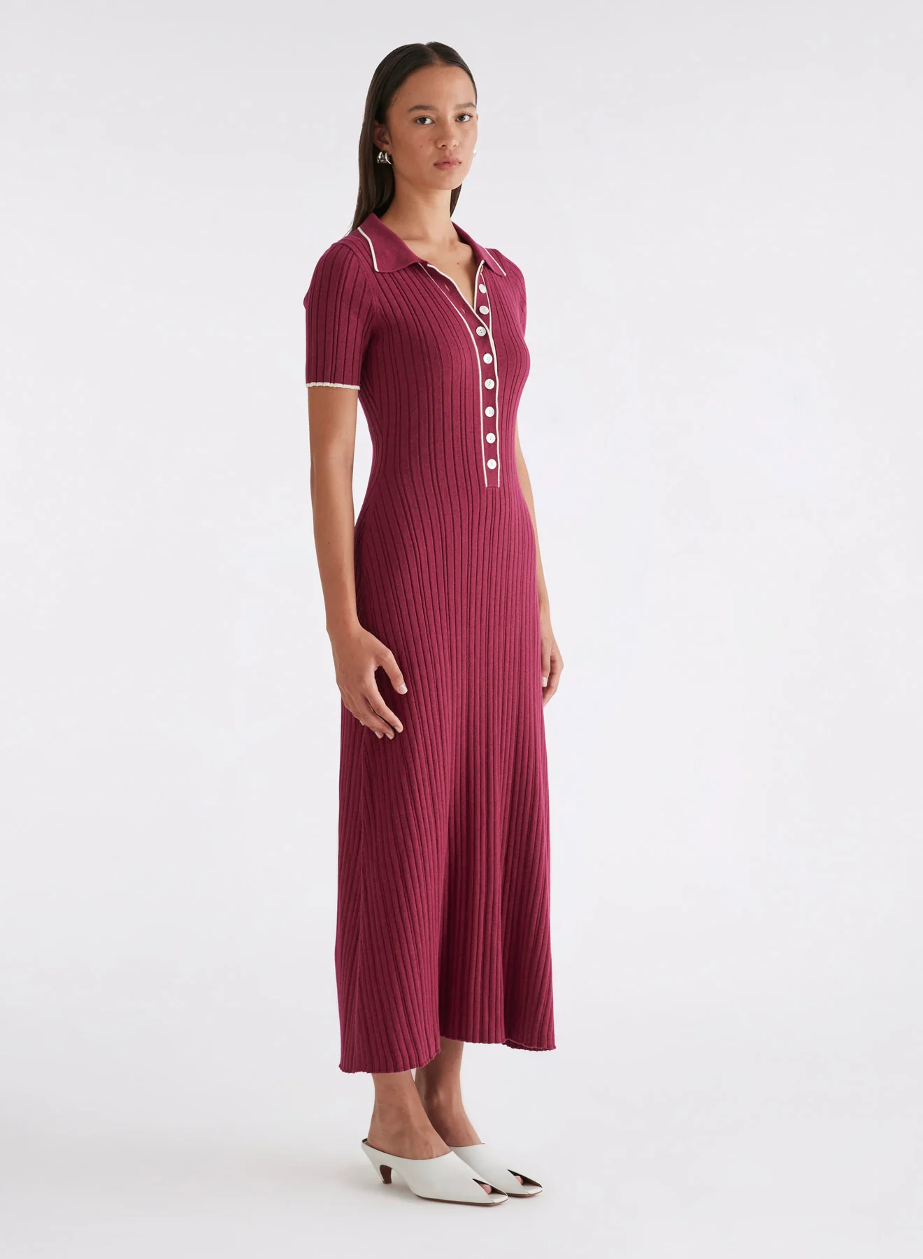 A dress to see you through any occasion, the Penelope Dress in Cherry w SIlence Trim is knitted from a soft 100% cotton that gracefully skims the frame. Designed with a polo inspired button placket and contrast trimming, this universally flattering silhouette falls from the hips into a softly flared hem.