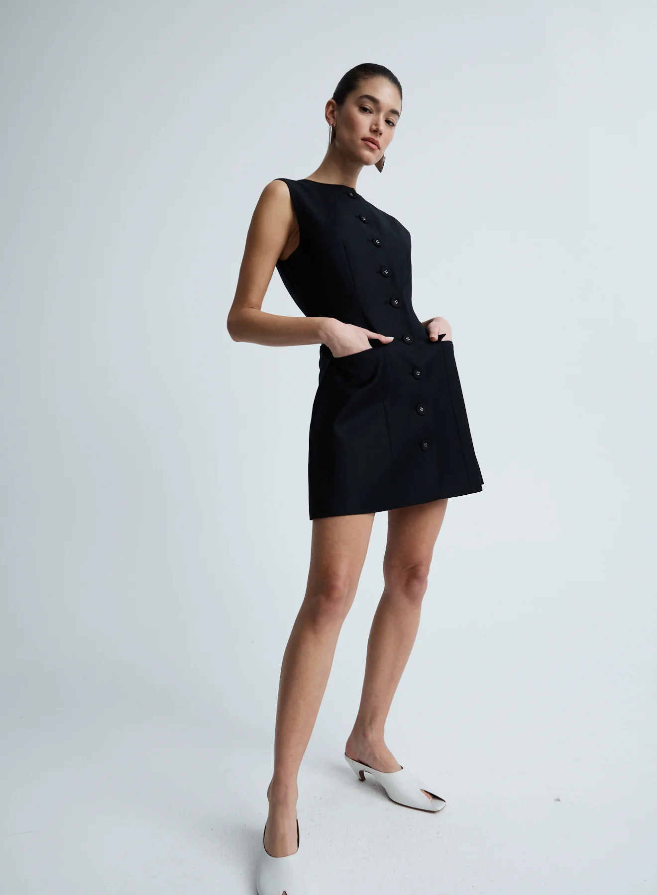 The Sofia Dress in Black is cut in a seasonless lightweight wool blend made for endless wardrobe rotation. A sleeveless tailored mini dress completed with a high round neckline, and waist defining lines. Detailed with self covered buttons, flap pockets and complete lining. Style with flats for daytime lunches or heels for evening events.