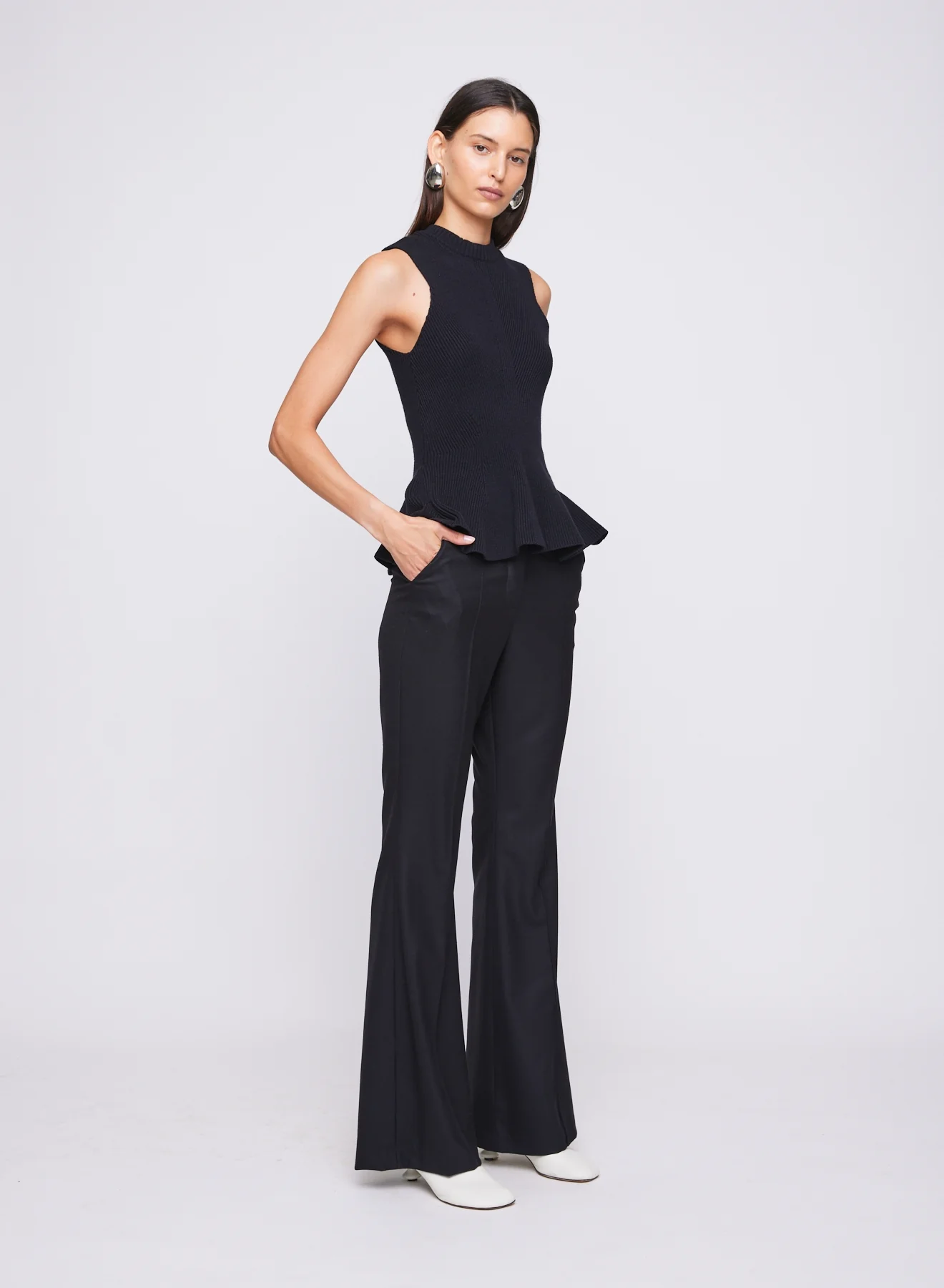 The Winnie Top in Raven showcases a thick knitted fabrication that sculpts the body to fall into an effortless peplum style hemline. Featuring a ribbed round neckline and a sleeveless silhouette, perfect for your everyday transeasonal wardrobe. Style with theĀ Nico Pants in Black.